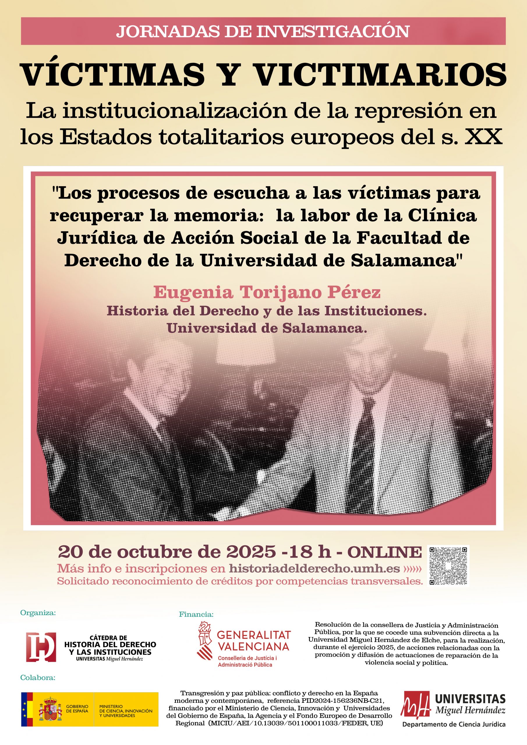 20 de octubre de 2025. 18:00h. «Los procesos de escucha a las víctimas para recuperar la memoria: la labor de la Clínica Jurídica de Acción Social de la Facultad de Derecho de la Universidad de Salamanca». Eugenia Torijano Pérez, Universidad de Salamanca.