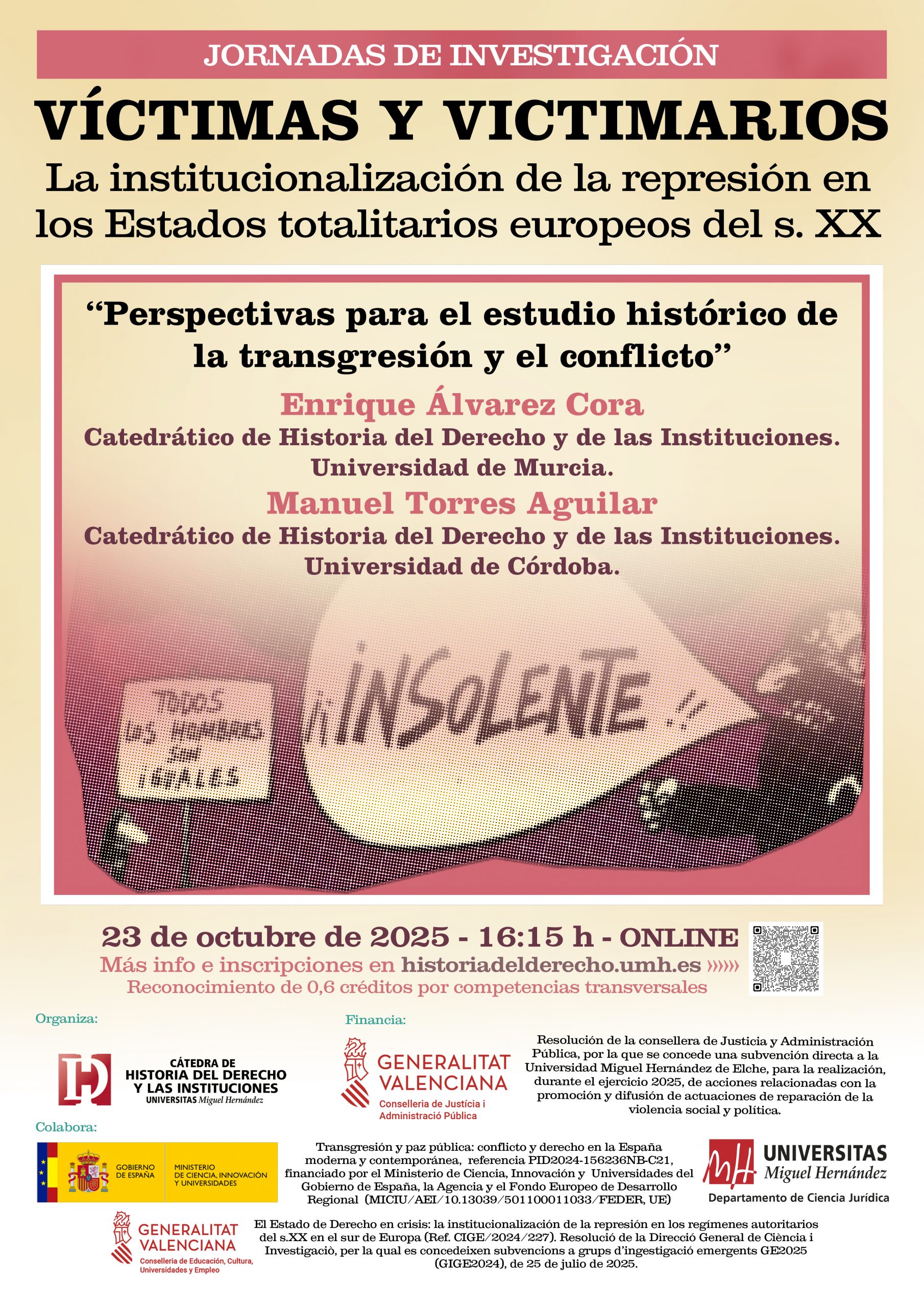 23 de octubre de 2025. 16:15h. “Perspectivas para el estudio histórico de la transgresión y el conflicto”. Enrique Álvarez Cora, Universidad de Murcia, y Manuel Torres Aguilar, Universidad de Córdoba.