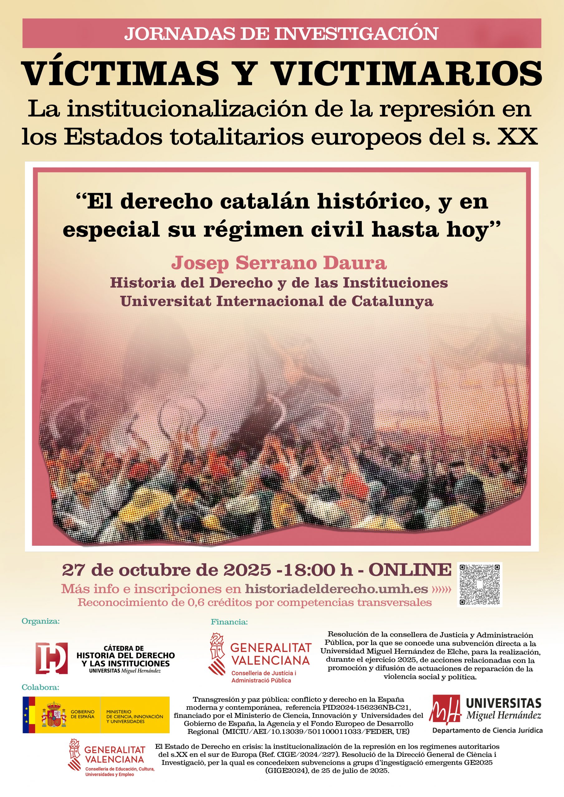 27 de octubre de 2025. 18:00h “El derecho catalán histórico, y en especial su régimen civil hasta hoy”. Josep Serrano Daura, Universitat Internacional de Catalunya.