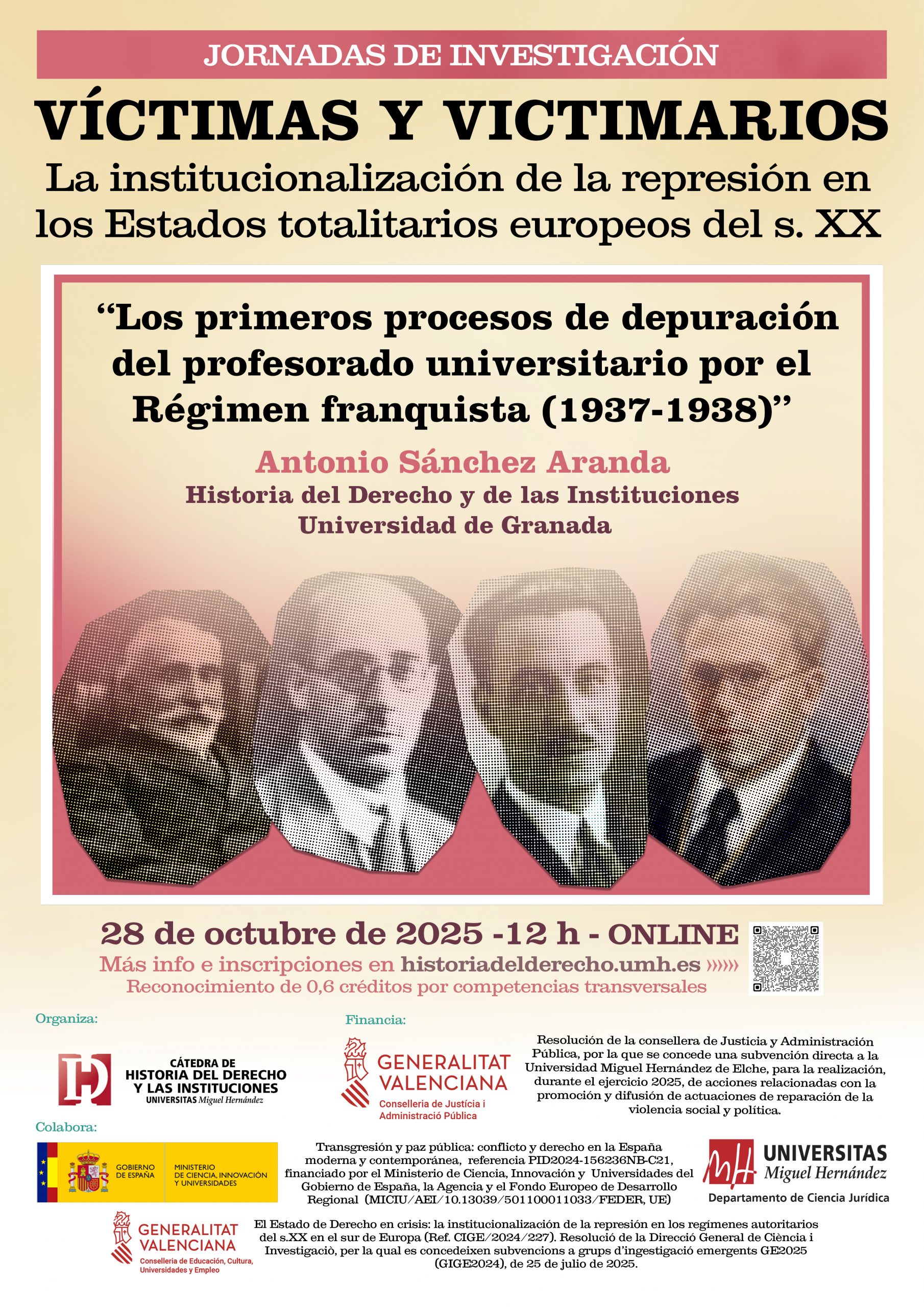 28 de octubre de 2025. 12:00h “Los primeros procesos de depuración del profesorado universitario por el Régimen franquista (1937-1938)”. Antonio Sánchez Aranda, Universidad de Granada.