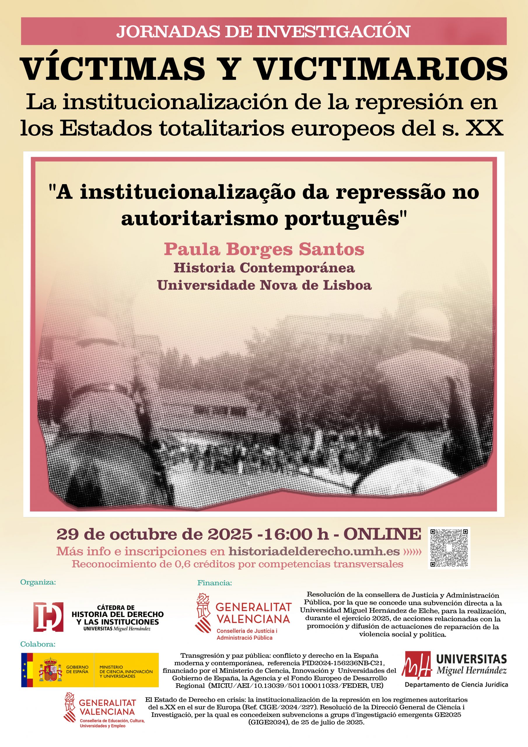 29 de octubre de 2025. 16:00h. «A institucionalização da repressão no autoritarismo português». Paula Borges Santos, Universidade Nova de Lisboa.