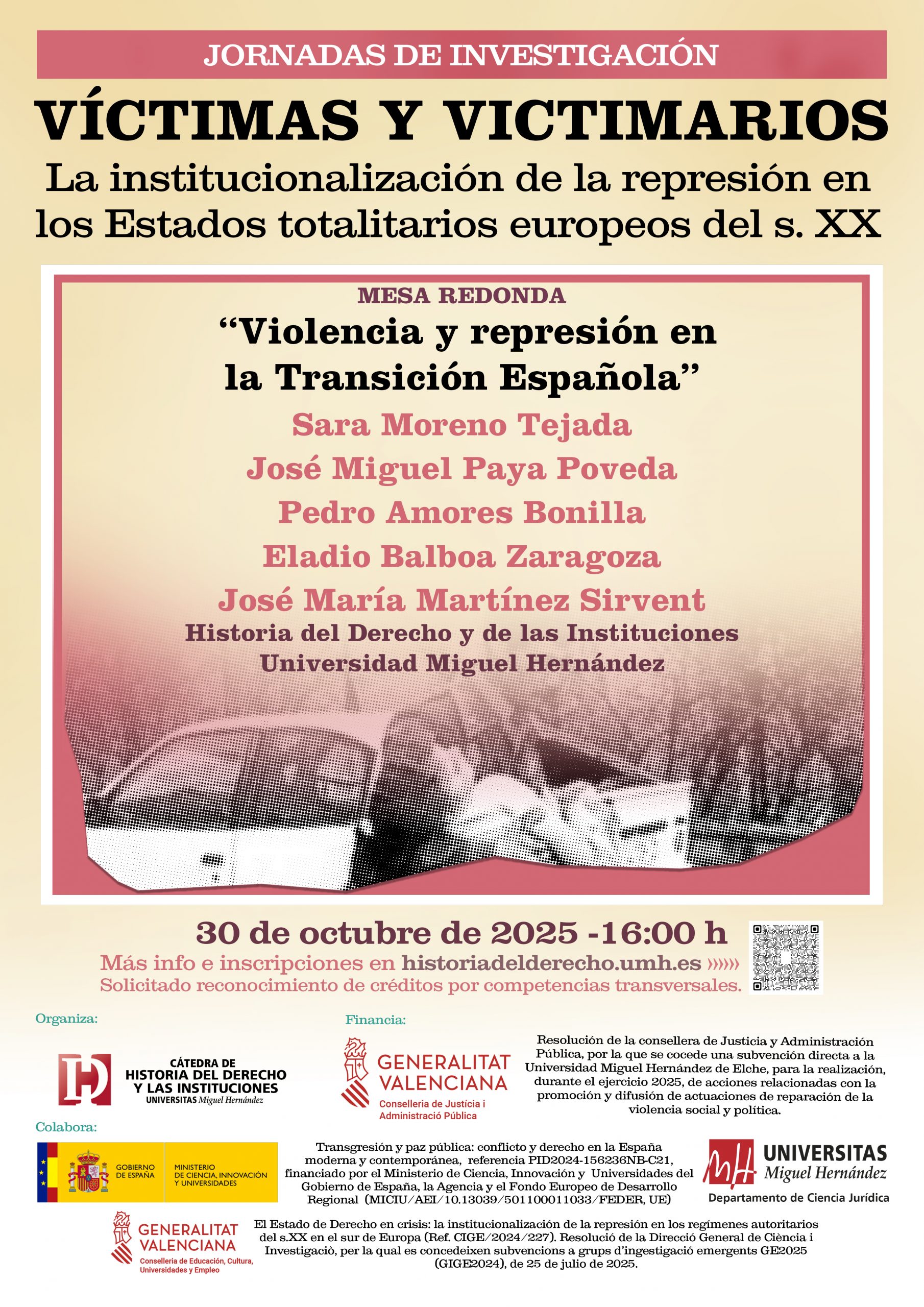 30 de octubre de 2025. 16:00h (Edificio Valona. Cinemateca). Mesa redonda: “Violencia y represión en la Transición Española” . Edificio Valona. Cinemateca.